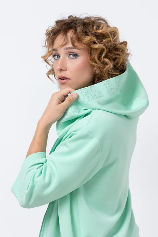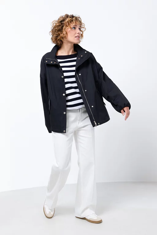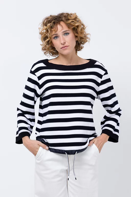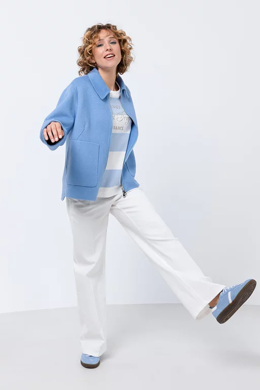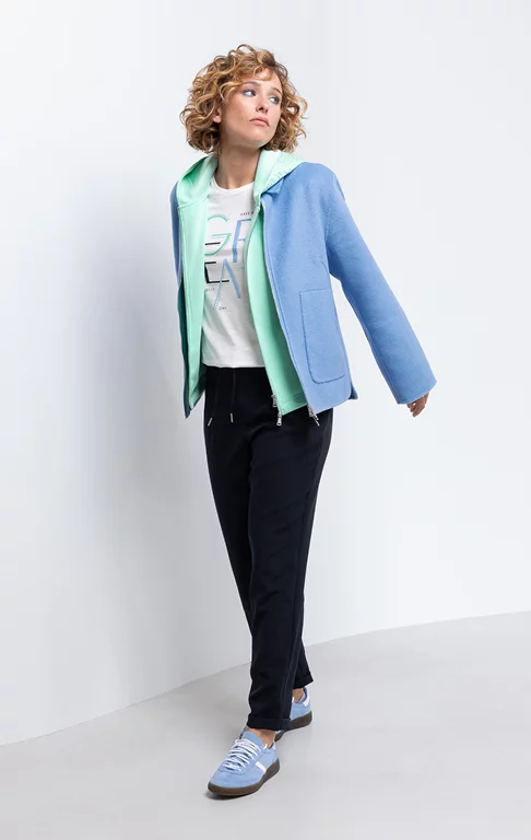 Outdoor zeigt sich sportiv und wetterfest als Blouson oder clean und farbig als Zipper-Jacke in einer hochwertigen Doubleface-Qualität. Feinstrick-Twinsets und Multicolor Strick mit Ajour-Muster sowie detailverliebte Blusen, 3D-Oberflächen bei Wirkwaren und neue Motiv-Shirts sorgen für ein facettenreiches Gesamtbild.